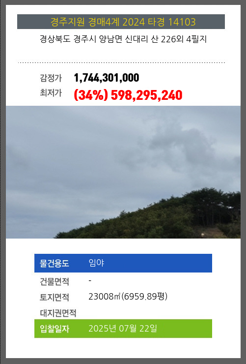 사건번호 2024 타경 14103 본건은 경상북도 경주시 양남면 신대리 산 226외 4필지소재하는 임야경매 물건의 포스팅입니다. 토지면적 [ 23008㎡ (6959.89평) ] 시세를 반영한 감정가 1,744,301,000에서3회 유찰되어