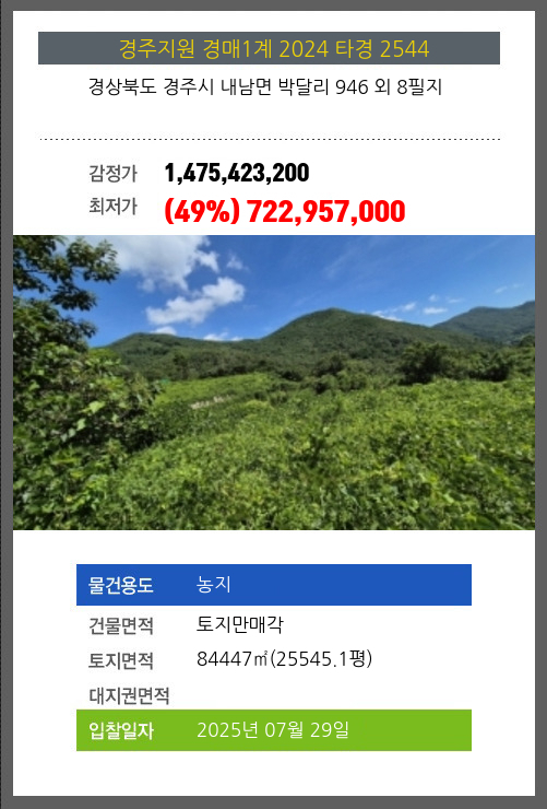 사건번호 2024 타경 2544 본건은 경상북도 경주시 내남면 박달리 946 외 8필지소재하는 농지경매 물건의 포스팅입니다. 건물면적 [ 토지만매각 ]토지면적 [ 84447㎡ (25545.1평) ] 시세를 반영한
