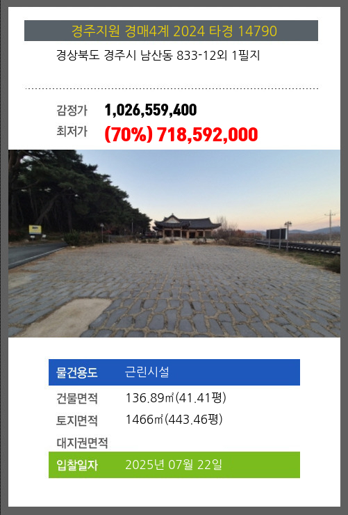사건번호 2024 타경 14790 본건은 경상북도 경주시 남산동 833-12외 1필지소재하는 근린시설경매 물건의 포스팅입니다. 건물면적 [ 136.89㎡ (41.41평) ]토지면적 [ 1466㎡ (443.46평) ] 시세를 반영한 감정가