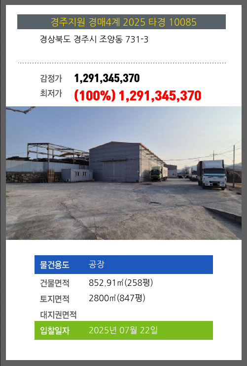 사건번호 2025 타경 10085 본건은 경상북도 경주시 조양동 731-3소재하는 공장경매 물건의 포스팅입니다. 건물면적 [ 852.91㎡ (258평) ]토지면적 [ 2800㎡ (847평) ] 시세를 반영한 감정가 1,291,345,370에서신건으로