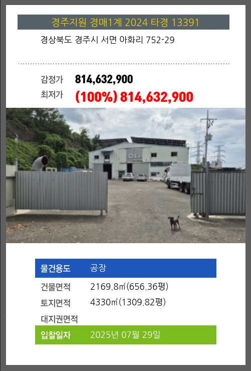 사건번호 2024 타경 13391 본건은 경상북도 경주시 서면 아화리 752-29소재하는 공장경매 물건의 포스팅입니다. 건물면적 [ 2169.8㎡ (656.36평) ]토지면적 [ 4330㎡ (1309.82평) ] 시세를 반영한 감정가
