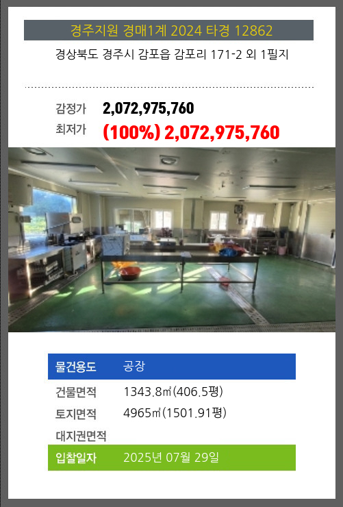 사건번호 2024 타경 12862 본건은 경상북도 경주시 감포읍 감포리 171-2 외 1필지소재하는 공장경매 물건의 포스팅입니다. 건물면적 [ 1343.8㎡ (406.5평) ]토지면적 [ 4965㎡ (1501.91평) ] 시세를