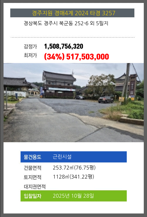 사건번호 2024 타경 3257 본건은 경상북도 경주시 북군동 252-6 외 5필지소재하는 근린시설경매 물건의 포스팅입니다. 건물면적 [ 253.72㎡ (76.75평) ]토지면적 [ 1128㎡ (341.22평) ] 시세를 반영한