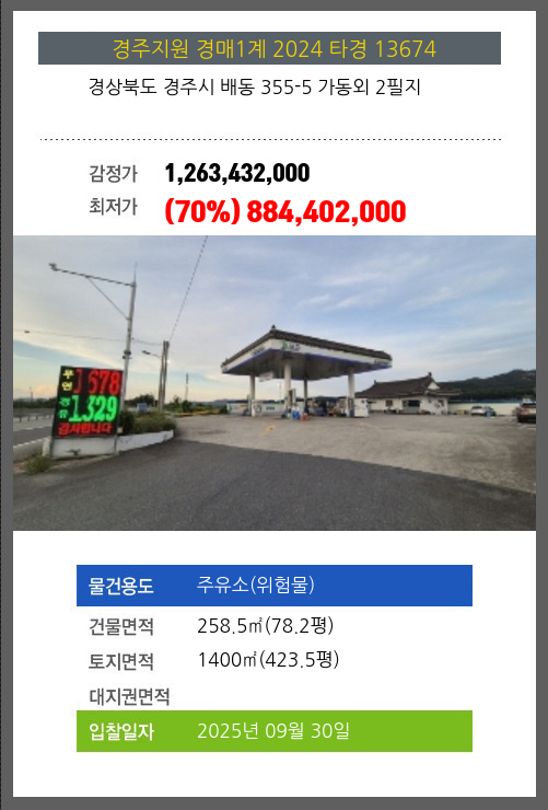 사건번호 2024 타경 13674 본건은 경상북도 경주시 배동 355-5 가동외 2필지소재하는 주유소(위험물)경매 물건의 포스팅입니다. 건물면적 [ 258.5㎡ (78.2평) ]토지면적 [ 1400㎡ (423.5평) ] 시세를 반영한