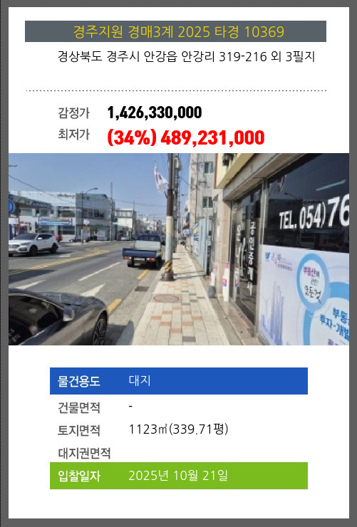 사건번호 2025 타경 10369 본건은 경상북도 경주시 안강읍 안강리 319-216 외 3필지소재하는 대지경매 물건의 포스팅입니다. 토지면적 [ 1123㎡ (339.71평) ] 시세를 반영한 감정가 1,426,330,000에서3회 유찰되어