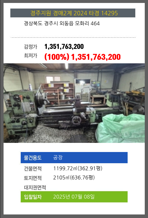 사건번호 2024 타경 14295 본건은 경상북도 경주시 외동읍 모화리 464소재하는 공장경매 물건의 포스팅입니다. 건물면적 [ 1199.72㎡ (362.91평) ]토지면적 [ 2105㎡ (636.76평) ] 시세를 반영한 감정가