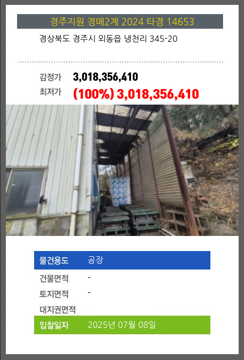사건번호 2024 타경 14653 본건은 경상북도 경주시 외동읍 냉천리 345-20소재하는 공장경매 물건의 포스팅입니다. 시세를 반영한 감정가 3,018,356,410에서신건으로 감정가 대비 100%최저가 3,018,356,410부터입찰에 참여할 수 있습니다. 입찰보증금은
