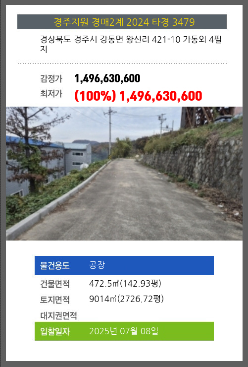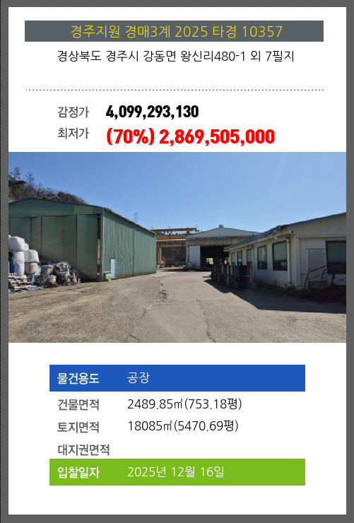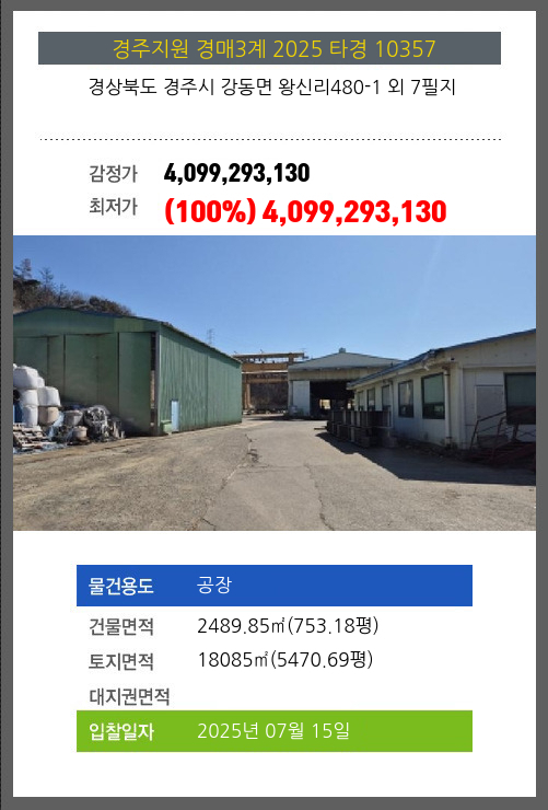 사건번호 2025 타경 10357 본건은 경상북도 경주시 강동면 왕신리480-1 외 7필지소재하는 공장경매 물건의 포스팅입니다. 건물면적 [ 2489.85㎡ (753.18평) ]토지면적 [ 18085㎡ (5470.69평) ] 시세를 반영한