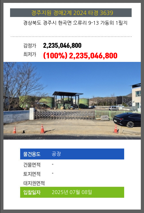 사건번호 2024 타경 3639 본건은 경상북도 경주시 현곡면 오류리 9-13 가동외 1필지소재하는 공장경매 물건의 포스팅입니다. 시세를 반영한 감정가 2,235,046,800에서신건으로 감정가 대비 100%최저가 2,235,046,800부터입찰에 참여할 수