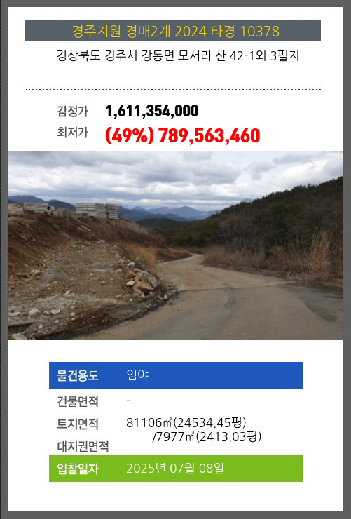 사건번호 2024 타경 10378 본건은 경상북도 경주시 강동면 모서리 산 42-1외 3필지소재하는 임야경매 물건의 포스팅입니다. 토지면적 [ 전체:81106㎡ (24534.45평) 매각지분:7977㎡ (2413.03평) ] 시세를 반영한 감정가