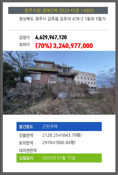 사건번호 2024 타경 14905 본건은 경상북도 경주시 감포읍 감포리 476-2 1동외 5필지소재하는 근린주택경매 물건의 포스팅입니다. 건물면적 [ 2128.25㎡ (643.79평) ]토지면적 [ 2978㎡ (900.84평) ] 시세를