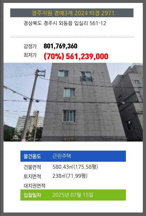 사건번호 2024 타경 2971 본건은 경상북도 경주시 외동읍 입실리 561-12소재하는 근린주택경매 물건의 포스팅입니다. 건물면적 [ 580.43㎡ (175.58평) ]토지면적 [ 238㎡ (71.99평) ] 시세를 반영한 감정가