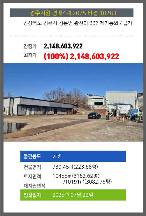 사건번호 2025 타경 10283 본건은 경상북도 경주시 강동면 왕신리 662 제가동외 4필지소재하는 공장경매 물건의 포스팅입니다. 건물면적 [ 739.45㎡ (223.68평) ]토지면적 [ 전체:10455㎡ (3162.62평) 매각지분:10191㎡ (3082.76평)