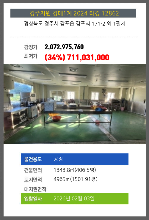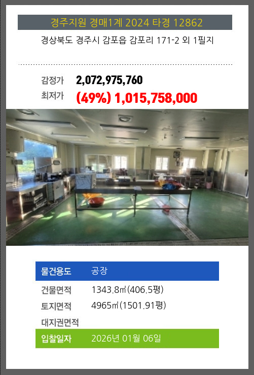 사건번호 2024 타경 12862 본건은 경상북도 경주시 감포읍 감포리 171-2 외 1필지소재하는 공장경매 물건의 포스팅입니다. 건물면적 [ 1343.8㎡ (406.5평) ]토지면적 [ 4965㎡ (1501.91평) ] 시세를