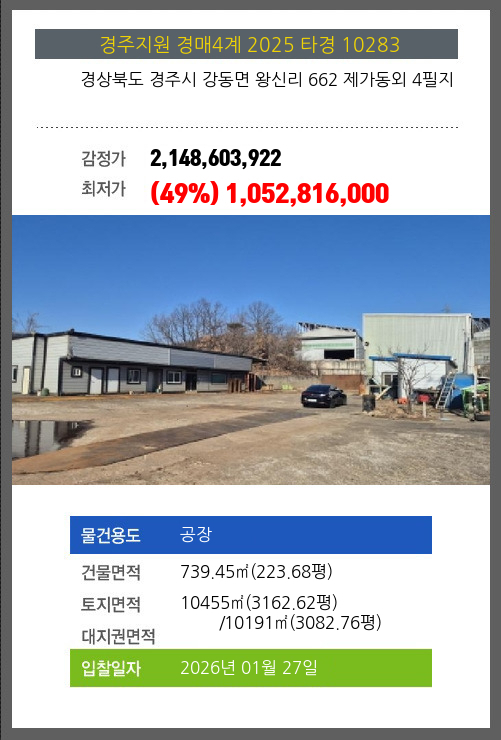 사건번호 2025 타경 10283 본건은 경상북도 경주시 강동면 왕신리 662 제가동외 4필지소재하는 공장경매 물건의 포스팅입니다. 건물면적 [ 739.45㎡ (223.68평) ]토지면적 [ 전체:10455㎡ (3162.62평) 매각지분:10191㎡ (3082.76평)