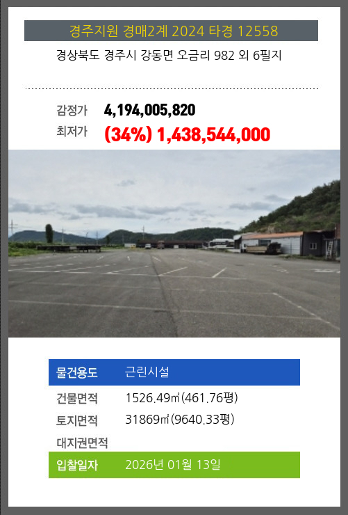 사건번호 2024 타경 12558 본건은 경상북도 경주시 강동면 오금리 982 외 6필지소재하는 근린시설경매 물건의 포스팅입니다. 건물면적 [ 1526.49㎡ (461.76평) ]토지면적 [ 31869㎡ (9640.33평) ] 시세를