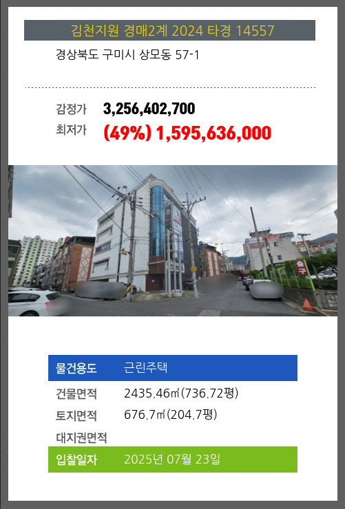 사건번호 2024 타경 14557 본건은 경상북도 구미시 상모동 57-1소재하는 근린주택경매 물건의 포스팅입니다. 건물면적 [ 2435.46㎡ (736.72평) ]토지면적 [ 676.7㎡ (204.7평) ] 시세를 반영한 감정가 3,256,402,700에서2회
