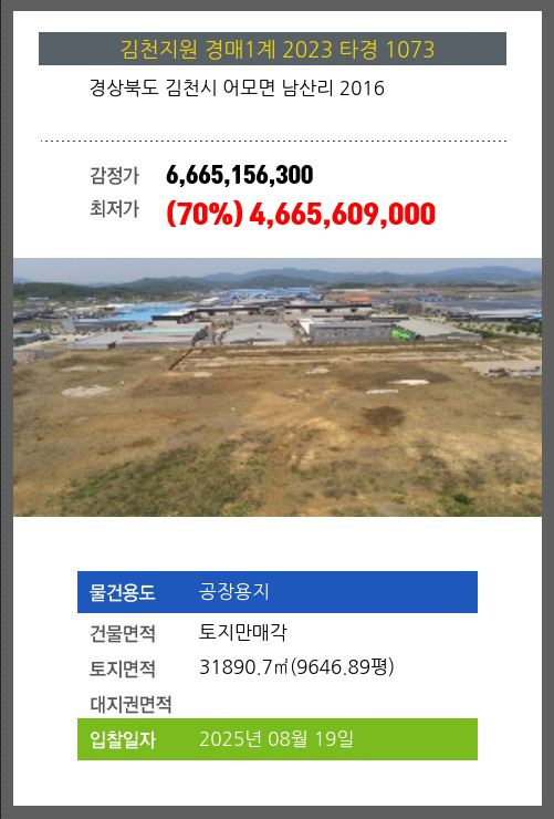 사건번호 2023 타경 1073 본건은 경상북도 김천시 어모면 남산리 2016소재하는 공장용지경매 물건의 포스팅입니다. 건물면적 [ 토지만매각 ]토지면적 [ 31890.7㎡ (9646.89평) ] 시세를 반영한 감정가 6,665,156,300에서1회