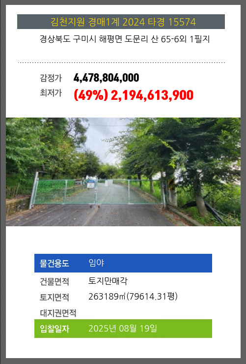 사건번호 2024 타경 15574 본건은 경상북도 구미시 해평면 도문리 산 65-6외 1필지소재하는 임야경매 물건의 포스팅입니다. 건물면적 [ 토지만매각 ]토지면적 [ 263189㎡ (79614.31평) ] 시세를 반영한
