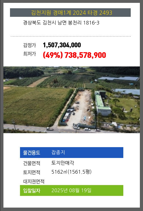 사건번호 2024 타경 2493 본건은 경상북도 김천시 남면 봉천리 1816-3소재하는 잡종지경매 물건의 포스팅입니다. 건물면적 [ 토지만매각 ]토지면적 [ 5162㎡ (1561.5평) ] 시세를 반영한 감정가 1,507,304,000에서2회