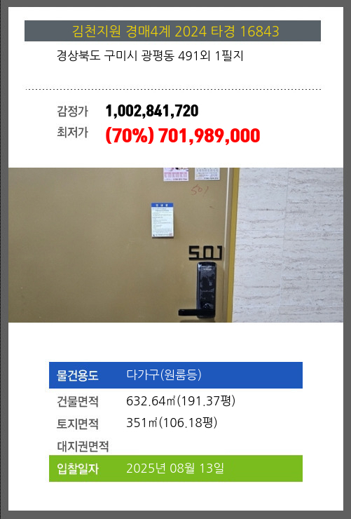 사건번호 2024 타경 16843 본건은 경상북도 구미시 광평동 491외 1필지소재하는 다가구(원룸등)경매 물건의 포스팅입니다. 건물면적 [ 632.64㎡ (191.37평) ]토지면적 [ 351㎡ (106.18평) ] 시세를 반영한 감정가