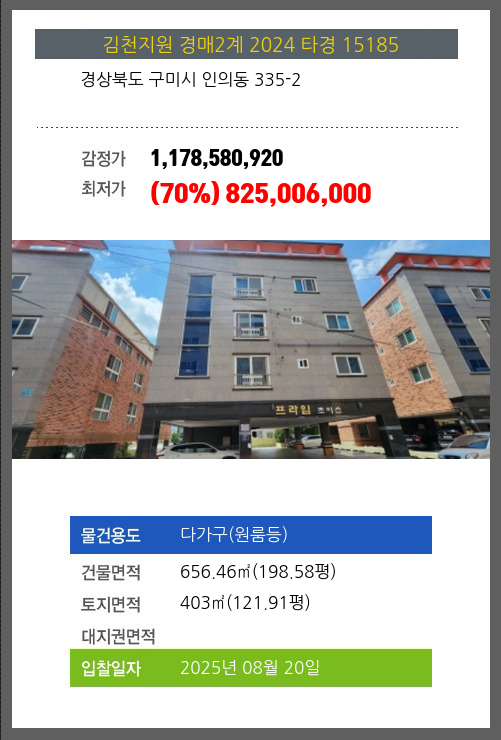 사건번호 2024 타경 15185 본건은 경상북도 구미시 인의동 335-2소재하는 다가구(원룸등)경매 물건의 포스팅입니다. 건물면적 [ 656.46㎡ (198.58평) ]토지면적 [ 403㎡ (121.91평) ] 시세를 반영한 감정가 1,178,580,920에서1회