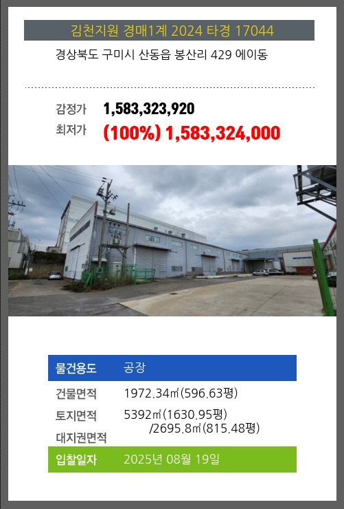 사건번호 2024 타경 17044 본건은 경상북도 구미시 산동읍 봉산리 429 에이동소재하는 공장경매 물건의 포스팅입니다. 건물면적 [ 1972.34㎡ (596.63평) ]토지면적 [ 전체:5392㎡ (1630.95평) 매각지분:2695.8㎡ (815.48평) ]