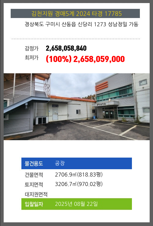사건번호 2024 타경 17785 본건은 경상북도 구미시 산동읍 신당리 1273 성남정밀 가동소재하는 공장경매 물건의 포스팅입니다. 건물면적 [ 2706.9㎡ (818.83평) ]토지면적 [ 3206.7㎡ (970.02평) ] 시세를