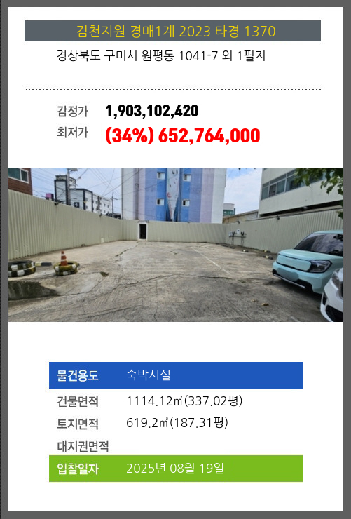 사건번호 2023 타경 1370 본건은 경상북도 구미시 원평동 1041-7 외 1필지소재하는 숙박시설경매 물건의 포스팅입니다. 건물면적 [ 1114.12㎡ (337.02평) ]토지면적 [ 619.2㎡ (187.31평) ] 시세를 반영한