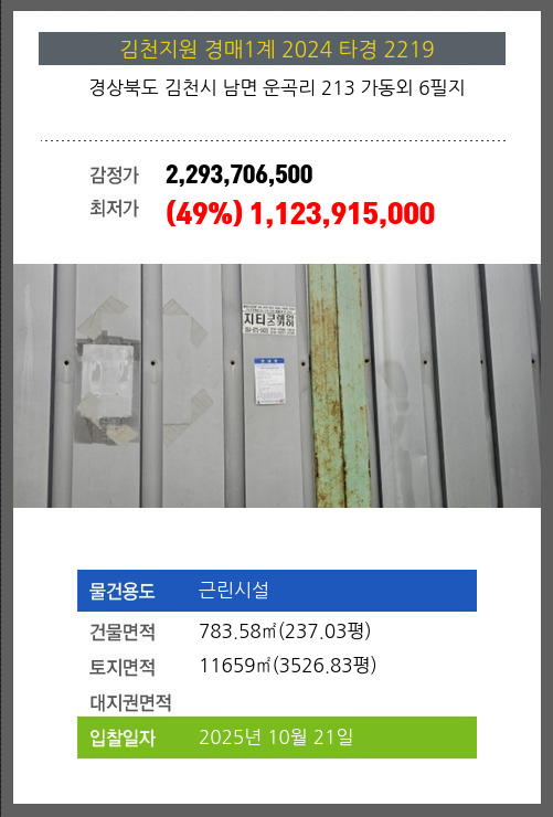 사건번호 2024 타경 2219 본건은 경상북도 김천시 남면 운곡리 213 가동외 6필지소재하는 근린시설경매 물건의 포스팅입니다. 건물면적 [ 783.58㎡ (237.03평) ]토지면적 [ 11659㎡ (3526.83평) ] 시세를
