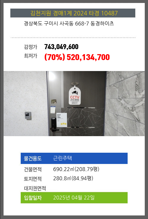 사건번호 2024 타경 10487 본건은 경상북도 구미시 사곡동 668-7 동경하이츠소재하는 근린주택경매 물건의 포스팅입니다. 건물면적 [ 690.22㎡ (208.79평) ]토지면적 [ 280.8㎡ (84.94평) ] 시세를 반영한 감정가