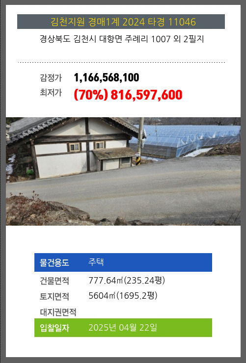 사건번호 2024 타경 11046 본건은 경상북도 김천시 대항면 주례리 1007 외 2필지소재하는 주택경매 물건의 포스팅입니다. 건물면적 [ 777.64㎡ (235.24평) ]토지면적 [ 5604㎡ (1695.2평) ] 시세를
