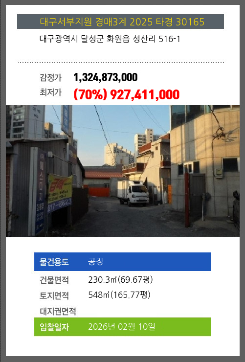 사건번호 2025 타경 30165 본건은 대구광역시 달성군 화원읍 성산리 516-1소재하는 공장경매 물건의 포스팅입니다. 건물면적 [ 230.3㎡ (69.67평) ]토지면적 [ 548㎡ (165.77평) ] 시세를 반영한 감정가