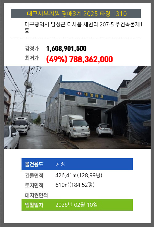 사건번호 2025 타경 1310 본건은 대구광역시 달성군 다사읍 세천리 207-5 주건축물제1동소재하는 공장경매 물건의 포스팅입니다. 건물면적 [ 426.41㎡ (128.99평) ]토지면적 [ 610㎡ (184.52평) ] 시세를 반영한