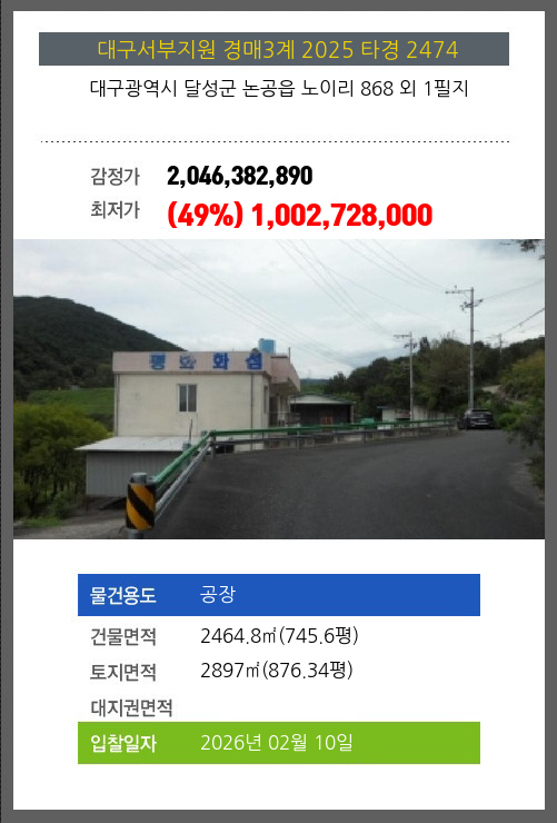 사건번호 2025 타경 2474 본건은 대구광역시 달성군 논공읍 노이리 868 외 1필지소재하는 공장경매 물건의 포스팅입니다. 건물면적 [ 2464.8㎡ (745.6평) ]토지면적 [ 2897㎡ (876.34평) ] 시세를