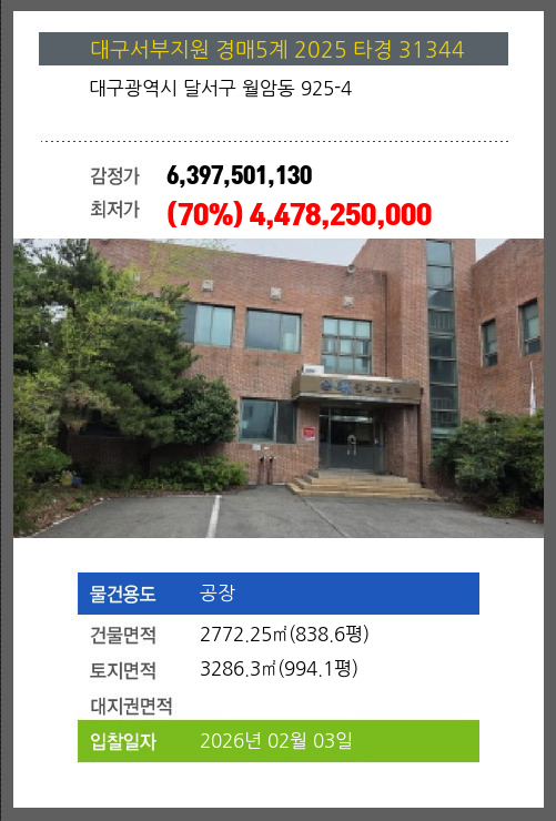 사건번호 2025 타경 31344 본건은 대구광역시 달서구 월암동 925-4소재하는 공장경매 물건의 포스팅입니다. 건물면적 [ 2772.25㎡ (838.6평) ]토지면적 [ 3286.3㎡ (994.1평) ] 시세를 반영한 감정가 6,397,501,130에서1회