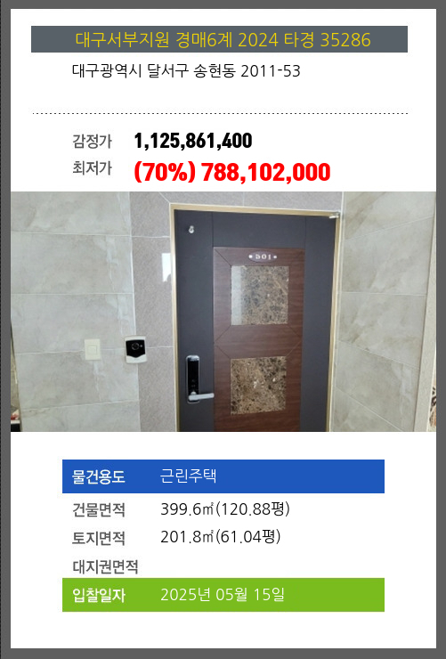 사건번호 2024 타경 35286 본건은 대구광역시 달서구 송현동 2011-53소재하는 근린주택경매 물건의 포스팅입니다. 건물면적 [ 399.6㎡ (120.88평) ]토지면적 [ 201.8㎡ (61.04평) ] 시세를 반영한 감정가 1,125,861,400에서1회