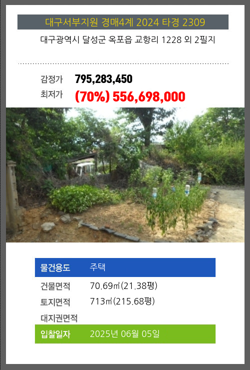 사건번호 2024 타경 2309 본건은 대구광역시 달성군 옥포읍 교항리 1228 외 2필지소재하는 주택경매 물건의 포스팅입니다. 건물면적 [ 70.69㎡ (21.38평) ]토지면적 [ 713㎡ (215.68평) ] 시세를