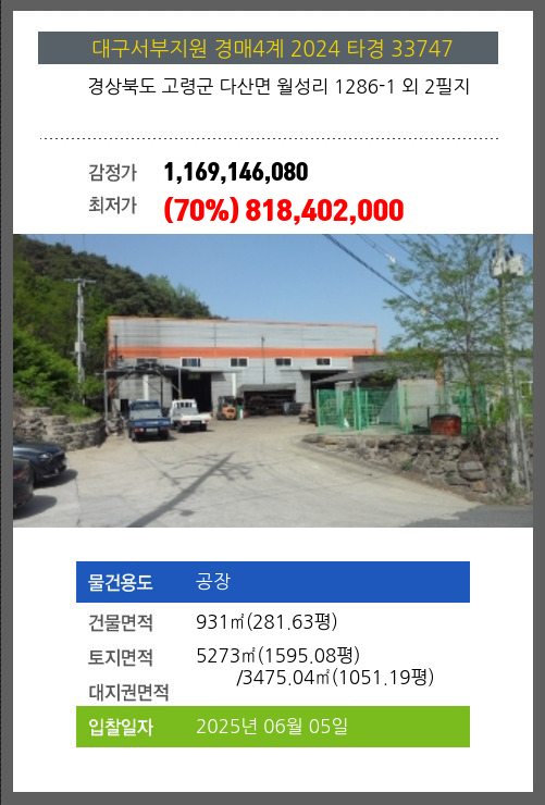 사건번호 2024 타경 33747 본건은 경상북도 고령군 다산면 월성리 1286-1 외 2필지소재하는 공장경매 물건의 포스팅입니다. 건물면적 [ 931㎡ (281.63평) ]토지면적 [ 전체:5273㎡ (1595.08평) 매각지분:3475.04㎡ (1051.19평)