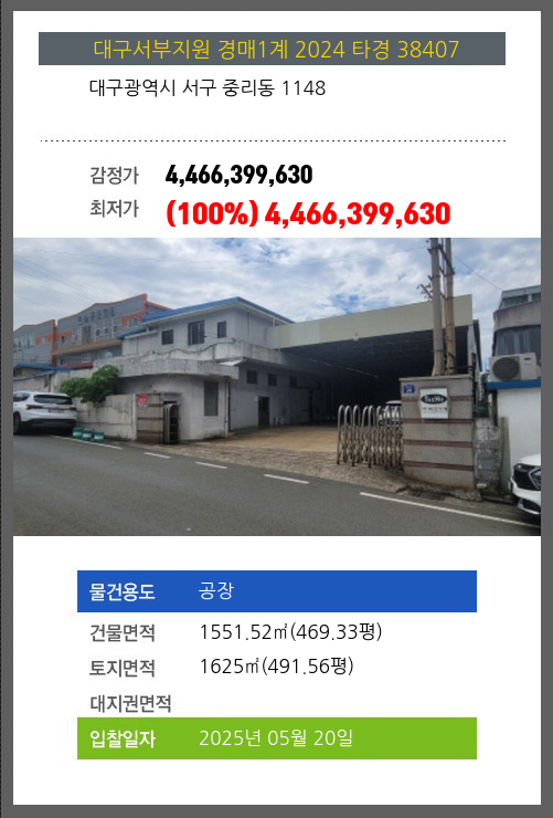 사건번호 2024 타경 38407 본건은 대구광역시 서구 중리동 1148소재하는 공장경매 물건의 포스팅입니다. 건물면적 [ 1551.52㎡ (469.33평) ]토지면적 [ 1625㎡ (491.56평) ] 시세를 반영한 감정가 4,466,399,630에서신건으로