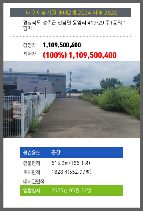 사건번호 2024 타경 2620 본건은 경상북도 성주군 선남면 동암리 419-29 주1동외 1필지소재하는 공장경매 물건의 포스팅입니다. 건물면적 [ 615.2㎡ (186.1평) ]토지면적 [ 1828㎡ (552.97평) ] 시세를