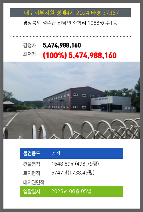 사건번호 2024 타경 37367 본건은 경상북도 성주군 선남면 소학리 1088-6 주1동소재하는 공장경매 물건의 포스팅입니다. 건물면적 [ 1648.89㎡ (498.79평) ]토지면적 [ 5747㎡ (1738.46평) ] 시세를 반영한