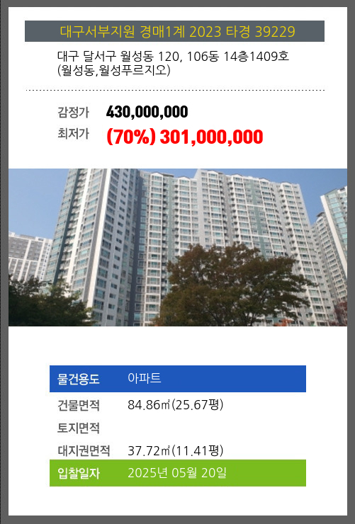 사건번호 2023 타경 39229 본건은 대구 달서구 월성동 120, 106동 14층1409호 (월성동,월성푸르지오)소재하는 아파트경매 물건의 포스팅입니다. 건물면적 [ 84.86㎡ (25.67평) ]대지권 [ 37.72㎡ (11.41평) ] 시세를
