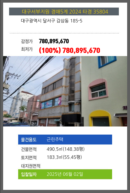 사건번호 2024 타경 35804 본건은 대구광역시 달서구 감삼동 185-5소재하는 근린주택경매 물건의 포스팅입니다. 건물면적 [ 490.5㎡ (148.38평) ]토지면적 [ 183.3㎡ (55.45평) ] 시세를 반영한 감정가 780,895,670에서2회
