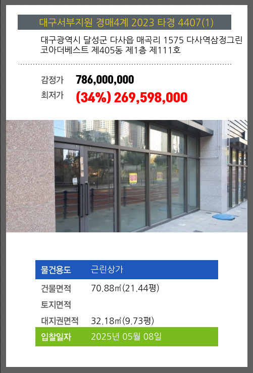 사건번호 2023 타경 4407(1) 본건은 대구광역시 달성군 다사읍 매곡리 1575 다사역삼정그린코아더베스트 제405동 제1층 제111호소재하는 근린상가경매 물건의 포스팅입니다. 건물면적 [ 70.88㎡ (21.44평) ]대지권 [ 32.18㎡ (9.73평)