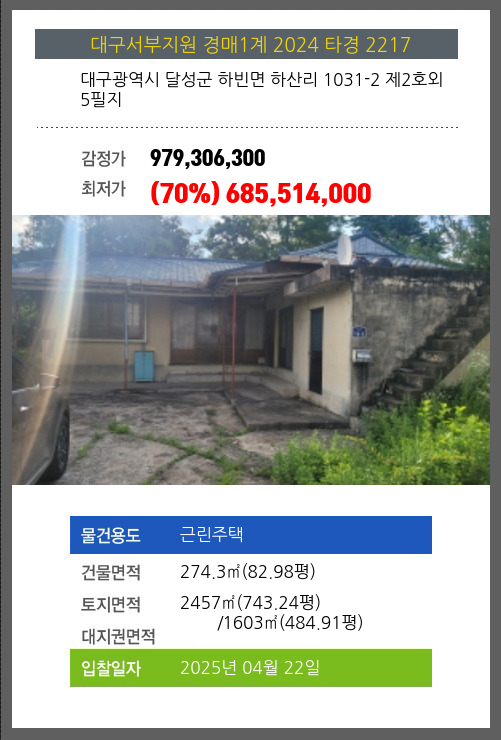 사건번호 2024 타경 2217 본건은 대구광역시 달성군 하빈면 하산리 1031-2 제2호외 5필지소재하는 근린주택경매 물건의 포스팅입니다. 건물면적 [ 274.3㎡ (82.98평) ]토지면적 [ 전체:2457㎡ (743.24평) 매각지분:1603㎡ (484.91평)