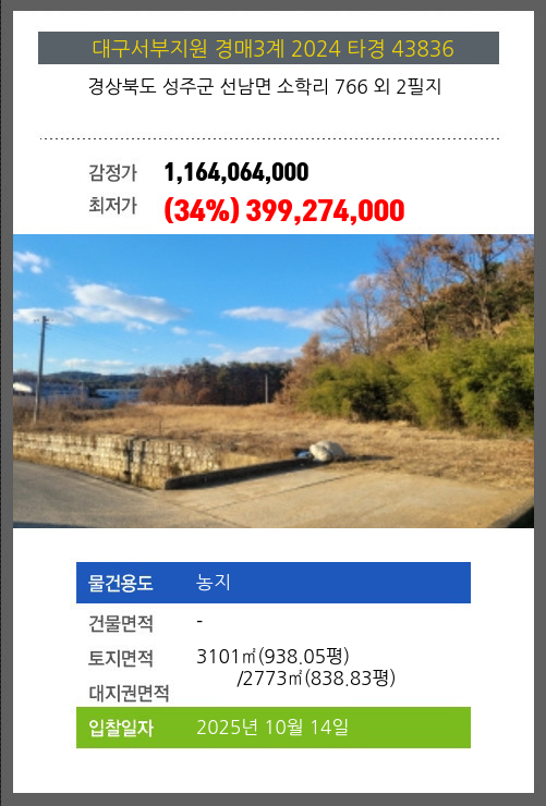사건번호 2024 타경 43836 본건은 경상북도 성주군 선남면 소학리 766 외 2필지소재하는 농지경매 물건의 포스팅입니다. 토지면적 [ 전체:3101㎡ (938.05평) 매각지분:2773㎡ (838.83평) ] 시세를 반영한 감정가