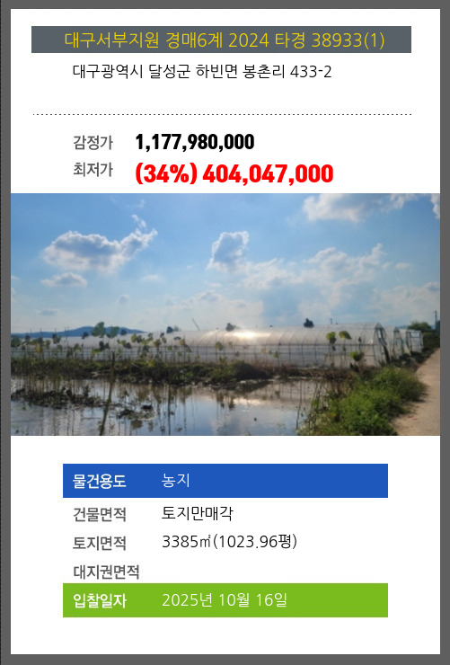 사건번호 2024 타경 38933(1) 본건은 대구광역시 달성군 하빈면 봉촌리 433-2소재하는 농지경매 물건의 포스팅입니다. 건물면적 [ 토지만매각 ]토지면적 [ 3385㎡ (1023.96평) ] 시세를 반영한 감정가 1,177,980,000에서3회
