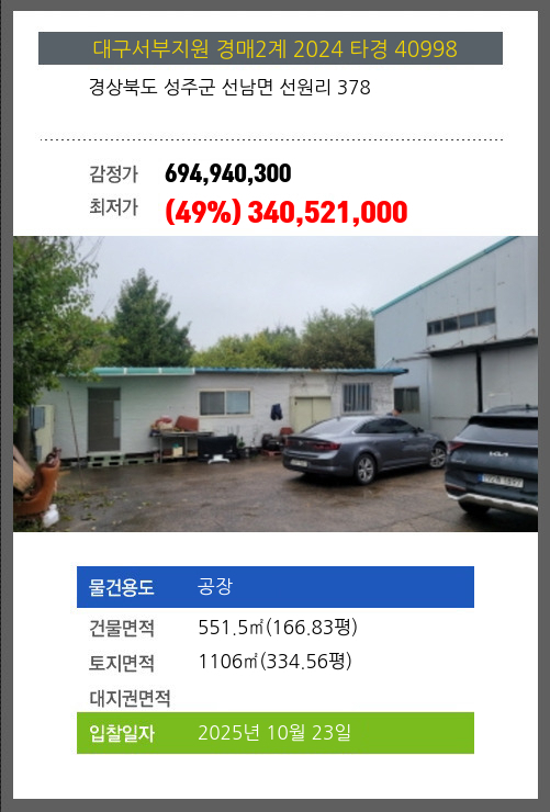 사건번호 2024 타경 40998 본건은 경상북도 성주군 선남면 선원리 378소재하는 공장경매 물건의 포스팅입니다. 건물면적 [ 551.5㎡ (166.83평) ]토지면적 [ 1106㎡ (334.56평) ] 시세를 반영한 감정가