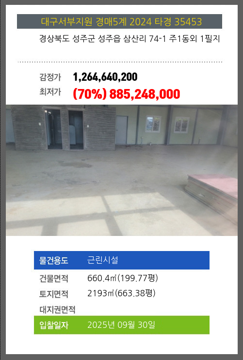 사건번호 2024 타경 35453 본건은 경상북도 성주군 성주읍 삼산리 74-1 주1동외 1필지소재하는 근린시설경매 물건의 포스팅입니다. 건물면적 [ 660.4㎡ (199.77평) ]토지면적 [ 2193㎡ (663.38평) ] 시세를